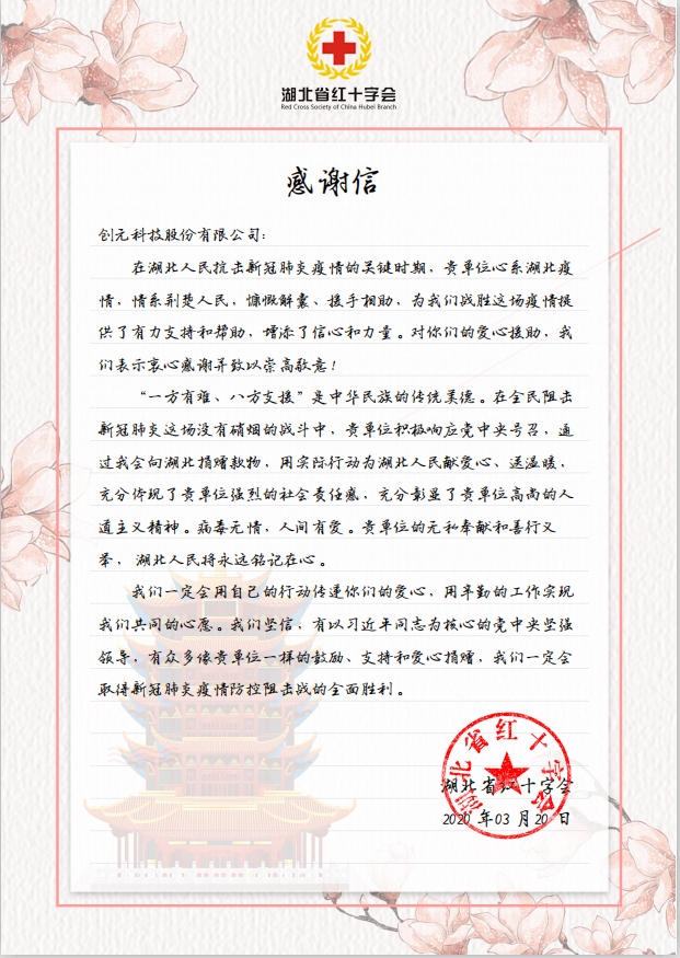 近日,公司收到來(lái)自湖北省紅十字會(huì)的感謝信,信中湖北省紅十字對(duì)公司在疫情期間的捐贈(zèng)行為表示了衷心的感謝,并表示將會(huì)繼續(xù)堅(jiān)定信念,取得新冠肺炎疫情防控狙擊戰(zhàn)的全面勝利。