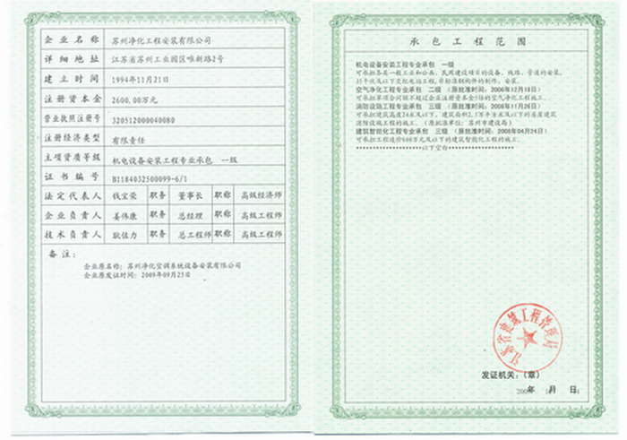 經(jīng)江蘇省建筑工程管理局批準(zhǔn),蘇凈集團(tuán)控股子公司——蘇州凈化工程安裝有限公司晉升為機(jī)電設(shè)備安裝工程專業(yè)承包一級(jí)資質(zhì)企業(yè)。自此,公司承接的機(jī)電設(shè)備安裝工程項(xiàng)目將不受項(xiàng)目規(guī)模限制,有利于公司進(jìn)一步開(kāi)拓市場(chǎng),提升競(jìng)爭(zhēng)力。