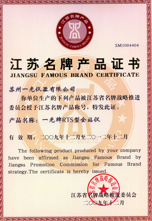 公司主導(dǎo)產(chǎn)品“一光牌RTS型全站儀”經(jīng)江蘇名牌戰(zhàn)略推進(jìn)委員會審核通過并向社會進(jìn)行了公示,于近日被江蘇省經(jīng)信委授予江蘇名牌產(chǎn)品證書。該產(chǎn)品質(zhì)量在本省同類產(chǎn)品中處于領(lǐng)先地位,并達(dá)到國際、國內(nèi)先進(jìn)水平,有較高的市場占有率和品牌知名度。此次榮獲江蘇名牌產(chǎn)品證書,表明了蘇州一光技術(shù)創(chuàng)新、產(chǎn)品開發(fā)能力已居國內(nèi)同行業(yè)前列。(蘇州一光提供)